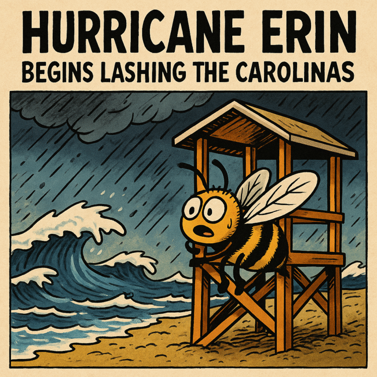 Erin, once a strapping Category 5 beast, has now “weakened” into a mere Category 2. Which is like saying Mike Tyson “weakened” after losing a couple of teeth—he’s still going to knock your jaw into next week if you make eye contact. The National Hurricane Center, with all the enthusiasm of a dentist explaining root canal prep, tells us that although Erin’s eye will stay offshore, the Outer Banks will be thoroughly battered. Waves up to 25 feet, storm surges between 1–4 feet, and rip currents so aggressive they could qualify for UFC belts.