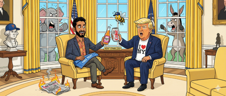 The simulation didn’t just glitch on November 21, 2025; it blue-screened, rebooted, and loaded a corrupted file from a different timeline. In the Oval Office, beneath the stern, oil-painted gaze of George Washington, the President of the United States sat next to the Mayor-elect of New York City. On paper, this should have been a cage match. In the blue corner, Zohran Mamdani: a 34-year-old democratic socialist, supporter of the BDS movement, and a man Trump had spent the last six months diagnosing as a “100% Communist Lunatic” and a “total nut job.” In the red corner, Donald Trump: the architect of the deportation force, the bane of the “radical left,” and a man Mamdani had recently diagnosed as a “fascist” and a “despot.”