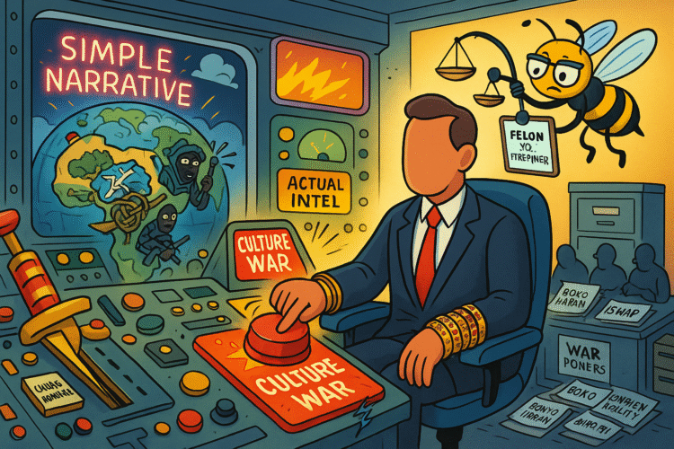 Let us begin this meditation in the American contradiction that keeps giving: a man with thirty four felony convictions cannot own a firearm, cannot pass a background check, cannot even walk into Cabela’s without violating release conditions, yet he can, apparently, direct the Pentagon to prepare for “possible action” on the African continent because he read a headline, panicked an evangelical email list, and decided God needed a new press secretary.