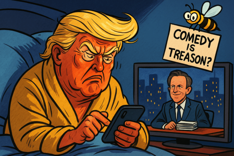 Hovering above Mar-a-Lago at 2:15 a.m., our cartoon bee clutches a glowing phone screen. Trump’s thumbs are a blur. The bee sighs: “Imagine losing sleep over Seth Meyers.” Then buzzes off to watch old Conan clips, because some of us know how to enjoy comedy without declaring it treason.